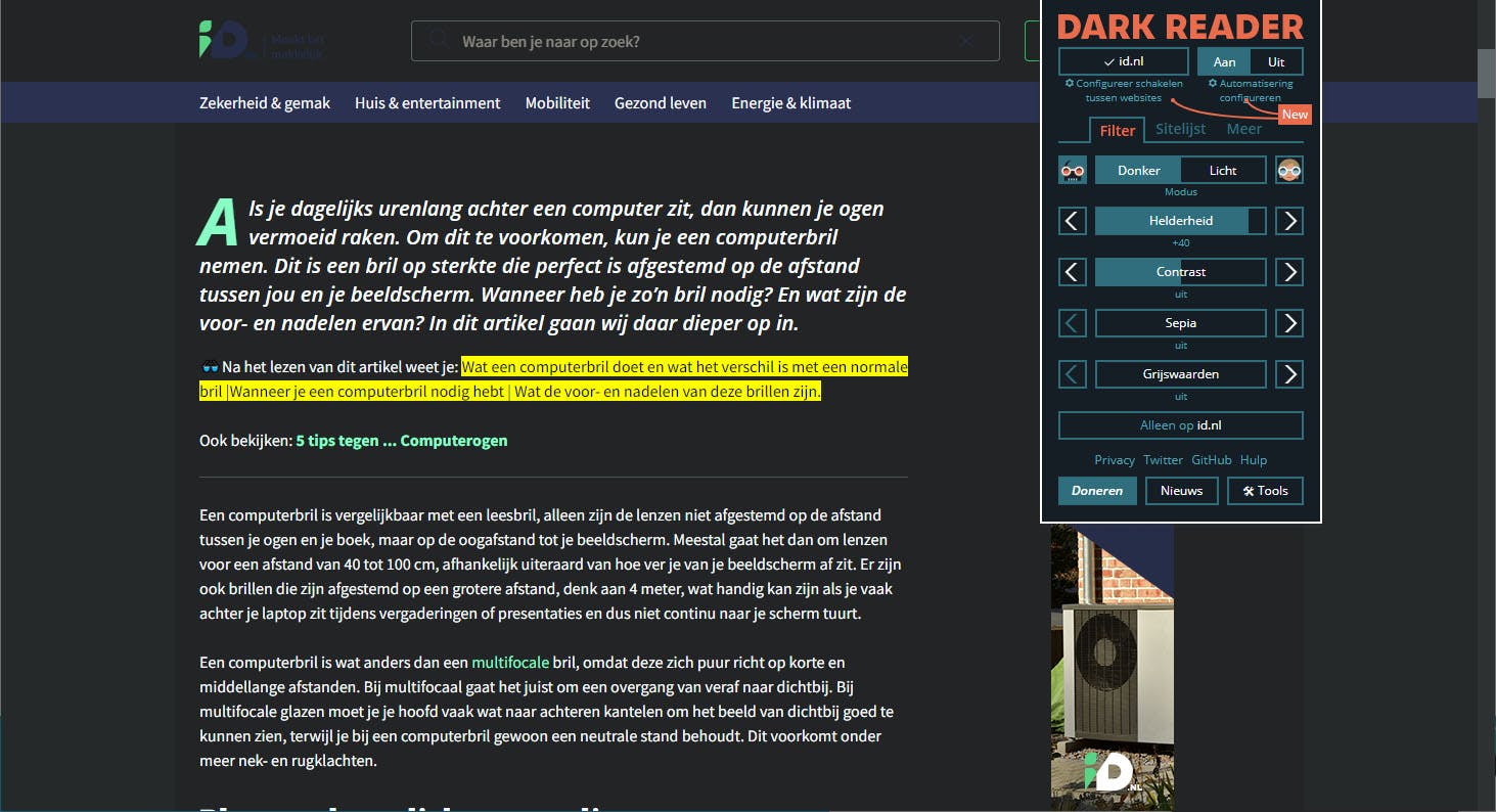 Sommige webpagina’s zien er aantrekkelijker uit in een donkere modus. Dark Reader biedt de mogelijkheid om deze modus volledig aan te passen aan jouw voorkeuren, waarbij je zelf de (tekst)stijl binnen de modus kunt instellen met schuifbalken zoals Helderheid, Contrast, Sepia en Grijswaarden. Met Dark Reader kun je eenvoudig schakelen tussen de donkere en lichte modus. Bovendien kun je een lijst van sites aanleggen waarin je kunt aangeven welke modus standaard actief moet zijn.
