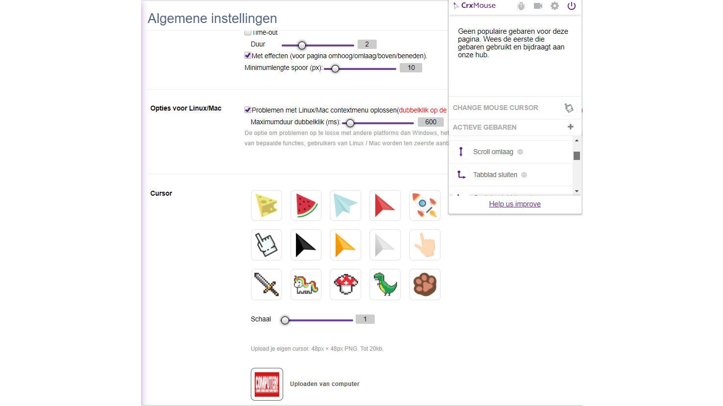 Als je niet graag steeds naar het toetsenbord grijpt om in je (Chromium-)browser te navigeren, is CrxMouse een handig programma om te installeren. Het wordt geleverd met een reeks standaard muisbewegingen waaraan bepaalde handelingen zijn gekoppeld, zoals Terug, Vooruit, Scrol omhoog/omlaag, Tabblad sluiten, Rechter tabblad, Opnieuw laden en meer. Je kunt ook andere muisbewegingen (met ingedrukte rechtermuisknop) aan deze acties koppelen. CrxMouse tekent de uitgevoerde muisbeweging even uit op de webpagina voordat de handeling wordt uitgevoerd. Ook leuk is dat je de muiscursor kunt wijzigen en hiervoor zelfs een eigen afbeelding gebruiken.