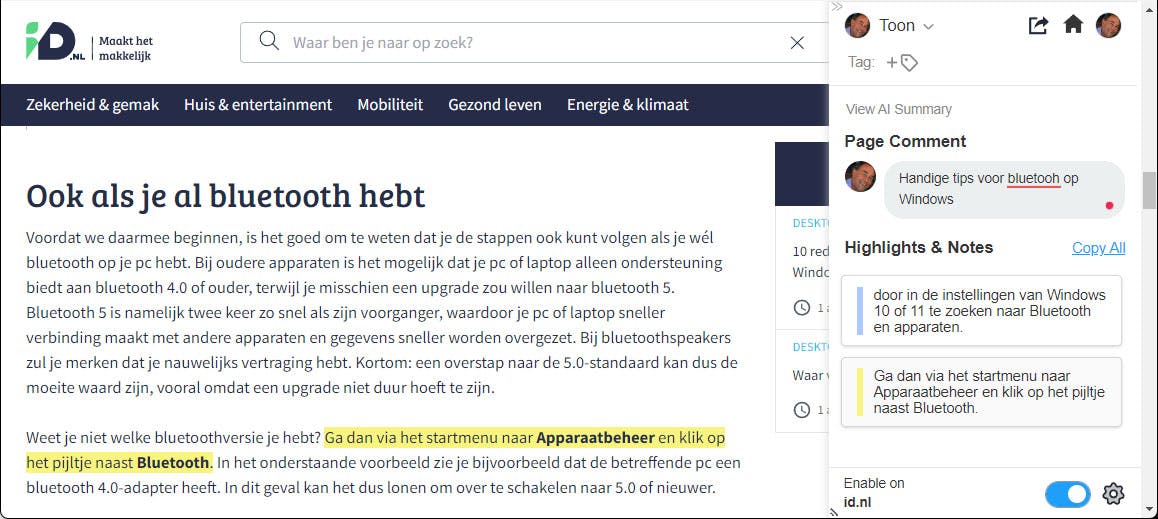 Je komt regelmatig interessante webpagina’s tegen, maar de url noteren of de pagina afdrukken is weinig efficiënt. Glasp biedt een praktischer oplossing. Meld je aan en label de bezochte webpagina’s, voeg commentaar toe of markeer belangrijke zinsdelen in de kleur van je keuze. Al je acties worden overzichtelijk op je persoonlijke Glasp-pagina bewaard. Bovendien is er een AI-gestuurde knop waarmee je een beknopte samenvatting van de pagina kunt genereren en kopiëren.