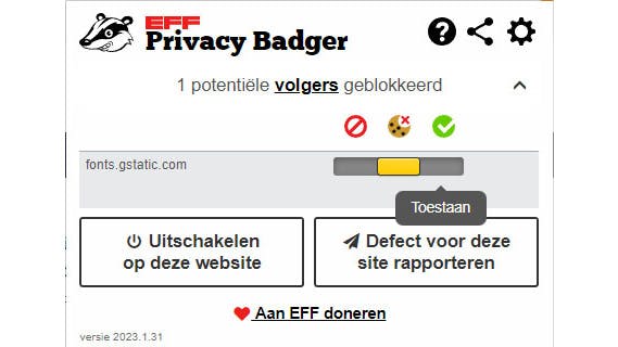 Veel websites proberen je surfbewegingen te volgen door gebruik te maken van onzichtbare trackers. Privacy Badger, een extensie van Electronic Frontier Foundation, biedt weerstand tegen deze praktijken. In plaats van een lijst met te blokkeren items bij te houden, detecteert de app automatisch trackers op basis van hun gedrag. Als de website automatisch doorgestuurde verzoeken om je niet langer te traceren negeert, zal Privacy Badger deze trackers automatisch blokkeren. Een teller geeft aan hoeveel trackers op een pagina zijn geblokkeerd. Indien gewenst, kun je ze alsnog toestaan.