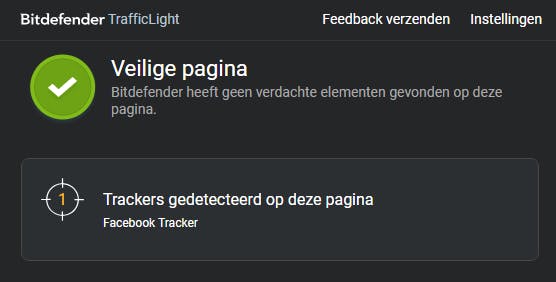 Bitdefender Traffic Light wil de gebruiker informeren over het veiligheidsniveau van de bezochte pagina’s door middel van een icoon in de knoppenbalk. Die wordt groen voor veilige pagina’s en rood voor potentieel kwaadaardige sites zoals phishing-pagina’s, frauduleuze pagina’s of die met malware. Handig is dat je deze icoontjes ook aantreft in de zoekresultaten van zoekmachines als Google, Bing en DuckDuckGo. En je krijgt ook nog feedback over eventuele trackers op de webpagina, in de vorm van een teller bij het icoontje.