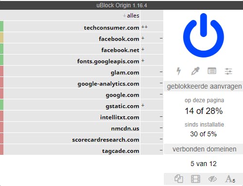 uBlock Origin is een rasechte advertentieblokker: alles wat naar reclame ruikt, kan worden geblokkeerd. Via een grote aan/uit-knop geef je aan of je de blokkering wilt in- of uitschakelen voor een bepaalde website. De tool is best flexibel, want je kunt diverse extra filterlijsten importeren met talloze sites waarop een of meer advertentienetwerken reclame hebben geplaatst. Met een muisklik kun je bijvoorbeeld alle grote media-elementen of pop-ups op een website (de)blokkeren.