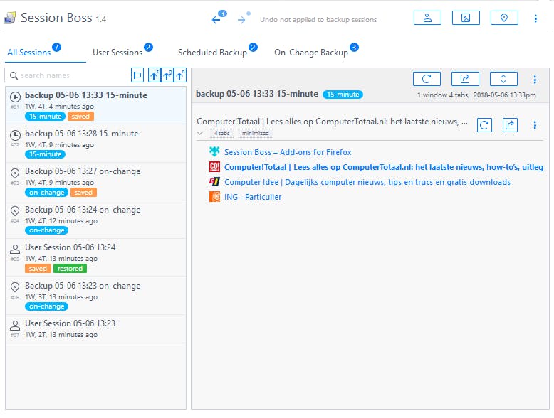 Zoals een aantal andere browsers, heeft ook Firefox een functie ingebouwd waarmee je sites uit een eerdere surfsessie kunt terughalen. Session Boss voegt daar nog enkele mogelijkheden aan toe. De extensie bewaart je tabbladen standaard elke vijftien minuten, maar je kunt die ook zelf op elk gewenst moment bewaren. Session Boss toont je vervolgens zowel de autoback-upsessies als de sessies die door de gebruiker zijn geïnitieerd. Via allerlei zoek- en sorteeropties vind je snel de gewenste sessie terug.