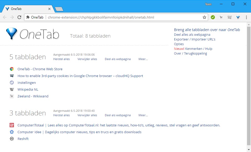 Je klikt en je surft en voor je het goed beseft heb je een hele hoop tabbladen in je browser geopend. Dat vergt niet alleen het nodige geheugen, het maakt het ook lastig het gewenste tabblad terug te vinden. Met één muisklik reduceert OneTab alle geopende tabbladen tot een enkel tabblad, waarbij de webpagina’s als linkjes worden getoond. Wil je een van die pagina’s opnieuw bezoeken, dan klik je op de link. Of je laat alle links in één keer weer in tabbladen omzetten.