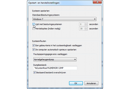 Bij een multi-bootsysteem wordt een opstartmenu getoond. Hierin kiest u welk besturingssysteem moet worden geladen, bijvoorbeeld Windows XP of Windows Vista. Nu u wilt terugkeren naar een single-bootsysteem, hebt u dat opstartmenu niet meer nodig, Windows Vista mag immers direct worden geladen. Tijd om het opstartmenu aan te passen. Klik op Start, Configuratiescherm en kies Systeem en onderhoud. Klik op Systeem. Links in het venster kiest u voor Geavanceerde systeeminstellingen. Op het tabblad Geavanceerd klikt u op de knop Instellingen (in het groepsvak Opstart- en herstelinstellingen). Het gaat hierbij om de sectie Systeem opstarten. Bij Standaardbesturingssysteem ziet u welk besturingssysteem als standaard-OS wordt geladen. Dit moet in ons voorbeeld uiteraard Windows Vista zijn, aangezien u Windows XP hebt verwijderd. Haal nu het vinkje weg bij de optie Lijst met besturingssystemen N seconden weergeven. Controleer ook of de andere optie Herstelopties (indien nodig) N seconden weergeven is uitgeschakeld. Klik op OK. U hebt hiermee het opstartmenu uitgeschakeld.