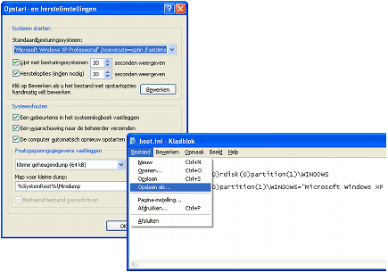Voordat u met Boot.ini aan de slag gaat, is het belangrijk dat u er een back-up van maakt. In geval van problemen kunt u daar naar terugkeren. Kies in het Configuratiescherm van Windows XP voor Prestaties en onderhoud, Systeem. Op het tabblad Geavanceerd klikt u op Instellingen (in de sectie Opstart- en herstelinstellingen). Klik op Bewerken. Het bestand Boot.ini wordt geopend in Kladblok. Kies vervolgens voor Bestand, Opslaan als. Maak een nieuwe map aan (bijvoorbeeld Back-up) en sla hierin de kopie van het bestand Boot.ini op.