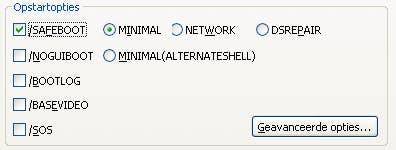 /SAFEBOOT Hiermee start u Windows in de veilige modus. Kies daarbij voor Minimal (zo min mogelijk stuurprogramma's laden), Network (met netwerkondersteuning), Safeboot:minimal (met alleen de opdrachtregel).
