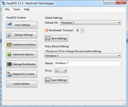 Zodra u EasyBCD hebt gestart, ziet u de hoofdinstellingen van het programma. Links in het venster ziet u een zevental knoppen, terwijl u rechts de bijbehorende instellingen vindt. Op de eerste pagina vindt u de instellingen zoals u ze mogelijk nog kent van het bestand Boot.ini uit Windows XP. Hier leest u bijvoorbeeld wat de wachttijd is van het opstartmenu, maar u ziet er ook de besturingssystemen die op uw multi-bootsysteem zijn geplaatst. Interessanter is de sectie Change Settings. Hier vindt u de instellingen waarmee u uw multi-bootsysteem aan kunt passen. In de sectie Global Settings kiest u bij Default OS welk besturingssysteem standaard moet worden geladen. Daarnaast bepaalt u hier de wachttijd van het opstartmenu, waarbij 30 seconden als standaard is ingesteld. Bevestig elke aanpassing met een klik op de knop Save Settings. In de sectie eronder - Entry-Based Settings - kunt u de instellingen van bestaande besturingssystemen aanpassen. Denk daarbij bijvoorbeeld aan de omschrijving en schijfletter van de schijf waarop Windows is geïnstalleerd.