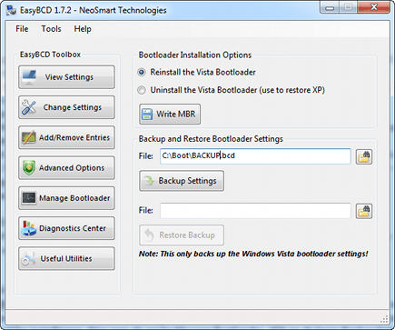 Met EasyBCD kunt u het opstartbestand van Windows Vista aanpassen. Uiteraard gaat het hier om een delicaat proces. Het is dan ook verstandig om voorafgaand hieraan een back-up te maken van de oorspronkelijke instellingen. Kies voor de sectie Manage Bootloader. Klik in de sectie Backup and Restore Bootloader Settings op de knop Backup Settings. Geef een geschikte naam en locatie op, en bevestig met een klik op Backup Settings. In geval van nood kunt u het bestand herstellen. Klik op de knop Bladeren (naast het vak File) en navigeer naar de eerder gemaakte kopie. Bevestig nu met een klik op de knop Restore Backup. Houdt u er rekening mee dat alleen de bootloader-instellingen van Windows Vista worden veiliggesteld in een back-up.