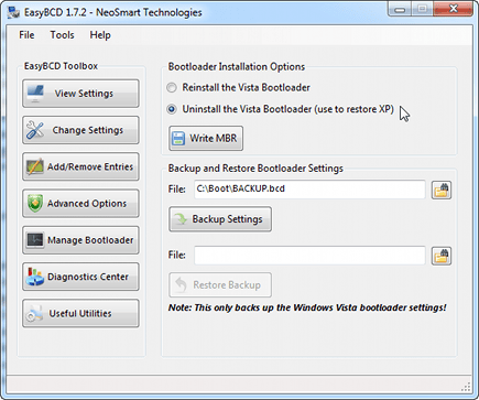 EasyBCD is vooral een interessant programma als zich problemen voordoen. U vindt de bijbehorende opties in de sectie Manage Bootloader. In de sectie Bootloader Installation Options kunt u kiezen voor Reinstall the Vista Bootloader. U gebruikt deze optie als het opstartmenu van Windows Vista is beschadigd en u dit wilt herstellen zonder Windows opnieuw te installeren. Wilt u echter gebruik maken van de bootloader van Windows XP (dit komt voor wanneer u Windows XP hebt geïnstalleerd na Windows Vista), dan kiest u voor Uninstall the Vista Bootloader (use to restore XP). Hiermee wordt de bootloader van Windows XP, die wezenlijk verschilt ten opzichte van die van Windows Vista, hersteld.