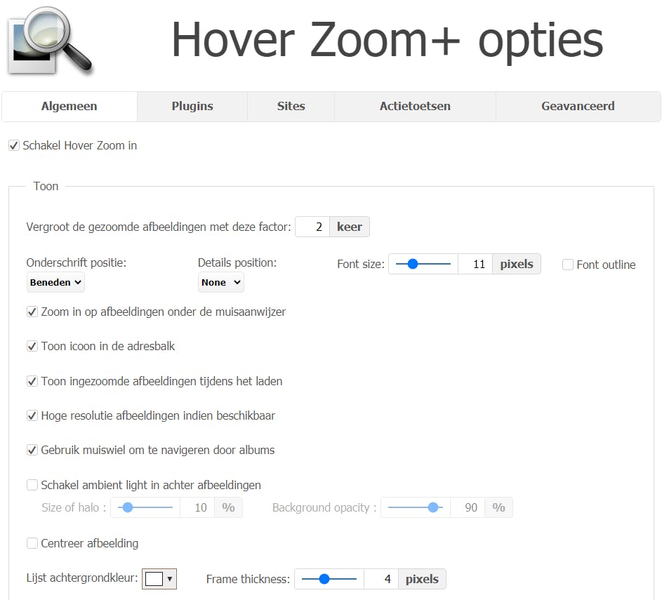 Via de instellingen kun je aangeven hoeveel groter de echte afbeelding moet worden getoond. Daarna beweeg je met de muis over een afbeelding en na een ingestelde vertraging krijg je die afbeelding – altijd passend – uitvergroot te zien.