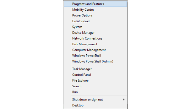 Bovenaan het power user menu staat een optie met de naam Programs and Features, waarmee je direct toegang krijgt tot het Control Panel om programma's te verwijderen.