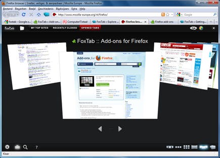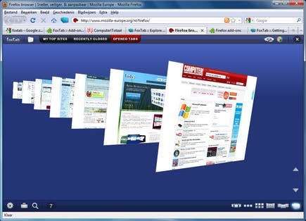 FoxTab werkt op Windows XP/Vista/7, Linux en Mac OS X, maar uw computer moet de 3D-effecten natuurlijk aankunnen en u moet ook Adobe Flash Player in Firefox geïnstalleerd hebben. Na de installatie en een herstart van Firefox ziet u dat de add-on zich met een icoontje links naast de adresbalk genesteld heeft. Klikt u hierop, dan krijgt u alle openstaande tabbladen in een 3D-opstelling te zien. Klikt u op één van de getoonde websites, dan krijgt u dit tabblad te zien in de normale 2D-lay-out van Firefox. FoxTab neemt ook de toetsencombinaties Ctrl+Tab en Ctrl+Shift+Tab over, dus zo kunt u met enkele klikken in drie dimensies naar een nieuw tabblad navigeren.