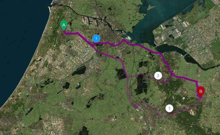 De routebeschrijving werkt hier een stuk beter dan bij Bing, maar als we kiezen voor een reis met openbaar vervoer, dan worden de vertrek-, overstap- en aankomstpunten met elkaar verbonden door een rechte lijn. Een reis per bus of trein is dat in het echt natuurlijk niet, maar Nokia Maps volgt niet de route van het spoor of de bus. Wel kiest Nokia Maps voor onze treinreis van Haarlem naar Amersfoort voor de meest optimale route, namelijk via Amsterdam Zuid en Hilversum: een reistijd van 1u15m ten opzichte van de twee keer zo langer durende via Micorosft Bing.
