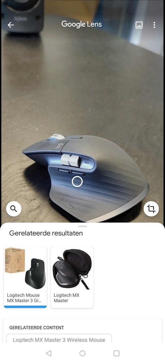 Zie je een object, dier of kunstwerk waar je meer over wil weten? Start je camera-app, schakel Lens in en mik de camera op het betreffende dier of object. Wacht tot je een wit puntje op het object of dier ziet en klik nu op de knop onderin. Google laat zien waar je – vermoedelijk – tegenaan kijkt. Dat kan, zoals op de screenshots hieronder, een Logitech MX Master 3 zijn, maar ook een dagpauwoogvlinder of schilderij van Rembrandt van Rijn.