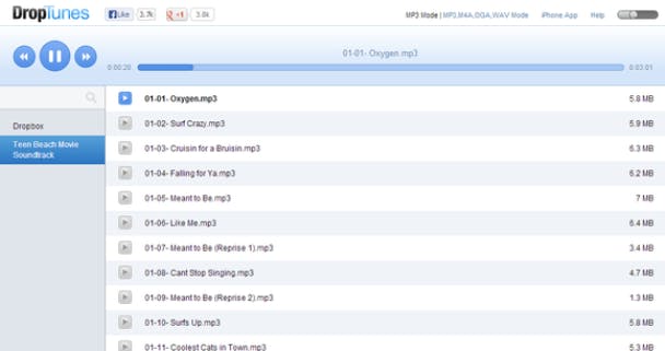De gratis web app DropTunes dient als streaming muziekspeler voor de audiobestanden in je Dropbox-account. Ga in je browser naar droptun.es en geef toestemming on je Dropbox-account te benaderen. Je audiobestanden worden automatisch gevonden en afgespeeld, zonder dat je ze hoeft te downloaden.