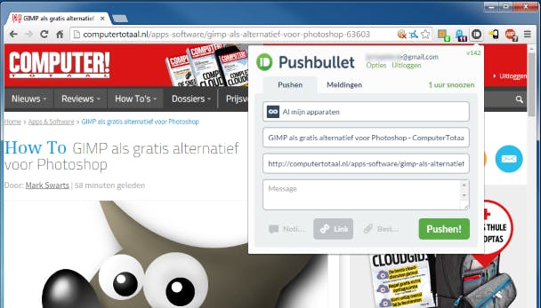 Heb je een Android-apparaat, dan mag Pushbullet niet ontbreken! Via de extensie en Android-app stuur je eenvoudig bestanden van en naar je pc, maar krijg je bijvoorbeeld ook je notificaties in je browser te zien.