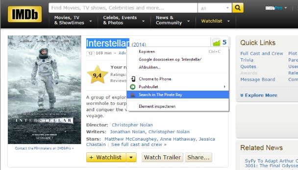 Wanneer je deze Chrome-extensie hebt geïnstalleerd, krijg je in het rechtermuisknopmenu de optie om direct te zoeken naar de geselecteerde tekst in The Pirate Bay. Simpeler en handiger kan haast niet.