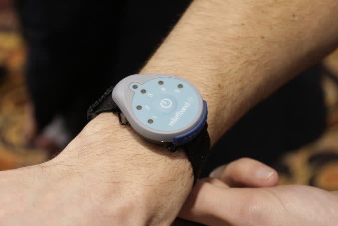 De gepatenteerde technologie van de Reliefband stimuleert de zenuwen aan de onderzijde van de pols met "diverse golven, frequenties en intensiteiten", zo claimt de maker. Dit met het doel misselijkheid bij onder meer wagenziekte en zwangerschap tegen te gaan. Helaas is het ons op de CES nog niet gelukt er achter te komen hoe deze wazige technologie nou precies in z'n werk gaat, want meer dan termen als "zenuwbanen", "impulsen" en "buikgolvel" konden we de fabrikant niet ontlokken. Het voelt vooralsnog dan ook vooral als homeopathische tech, maar dat wil natuurlijk niet zeggen dat het voor sommige mensen niet een (al dan niet placebo-achtige) uitkomst zal zijn.