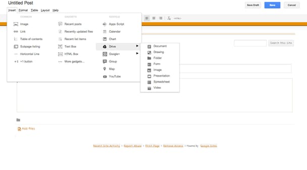Je kunt zelfs een presentatie op een Google Site inbedden. In Sites, klik op Insert > Drive > Presentation. Iedereen die naar je site navigeert kan dan direct vanaf de webpagina door de slides heen klikken.