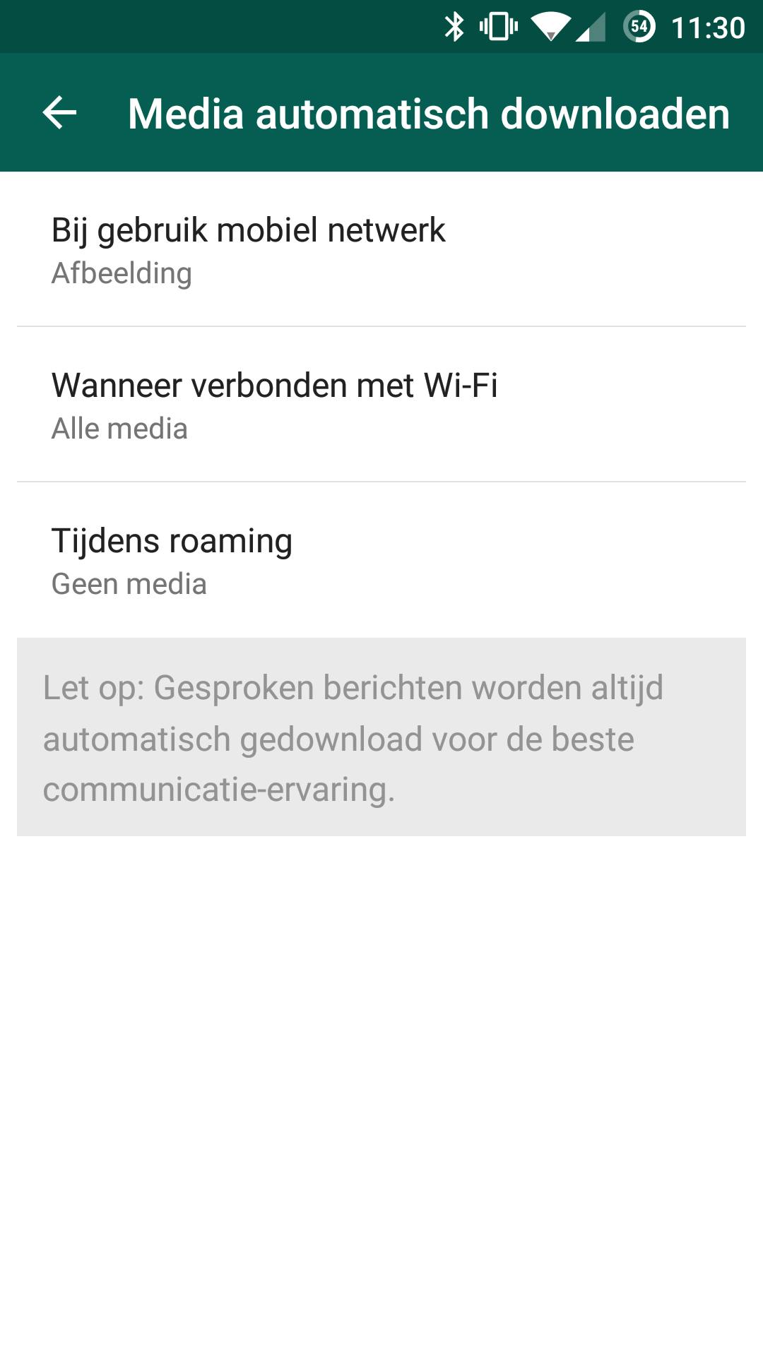 Je doet dat op Android en iOS via 'Menu' -> 'Instellingen' -> 'Chatinstellingen' -> 'Media automatisch downloaden'. Daar heb je een aantal opties, zoals wanneer je berichten downloadt wanneer je op 4G zit of juist op wifi. Die opties zijn zogenaamd bedoeld om data te besparen (foto's en video's kosten meer data), maar je kunt dit ook goed gebruiken voor je privacyinstellingen. Als je helemaal geen foto's automatisch wil laten downloaden, vink je bij alle opties niets aan.