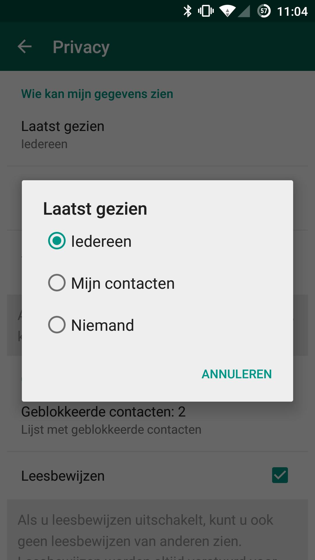 Je kunt ook uitzetten wanneer je voor het laatst online bent geweest. Dat is in combinatie met de blauwe vinkjes een goede manier om te verbergen wanneer je wel of niet in je app kijkt. Je doet dat door naar 'Menu' -> 'Instellingen' -> 'Account' -> 'Privacy' te gaan, en daar 'Laatst gezien' in te stellen. Je kunt dat instellen op 'iedereen', 'niemand', of alleen contacten die jouw nummer ook hebben opgeslagen.