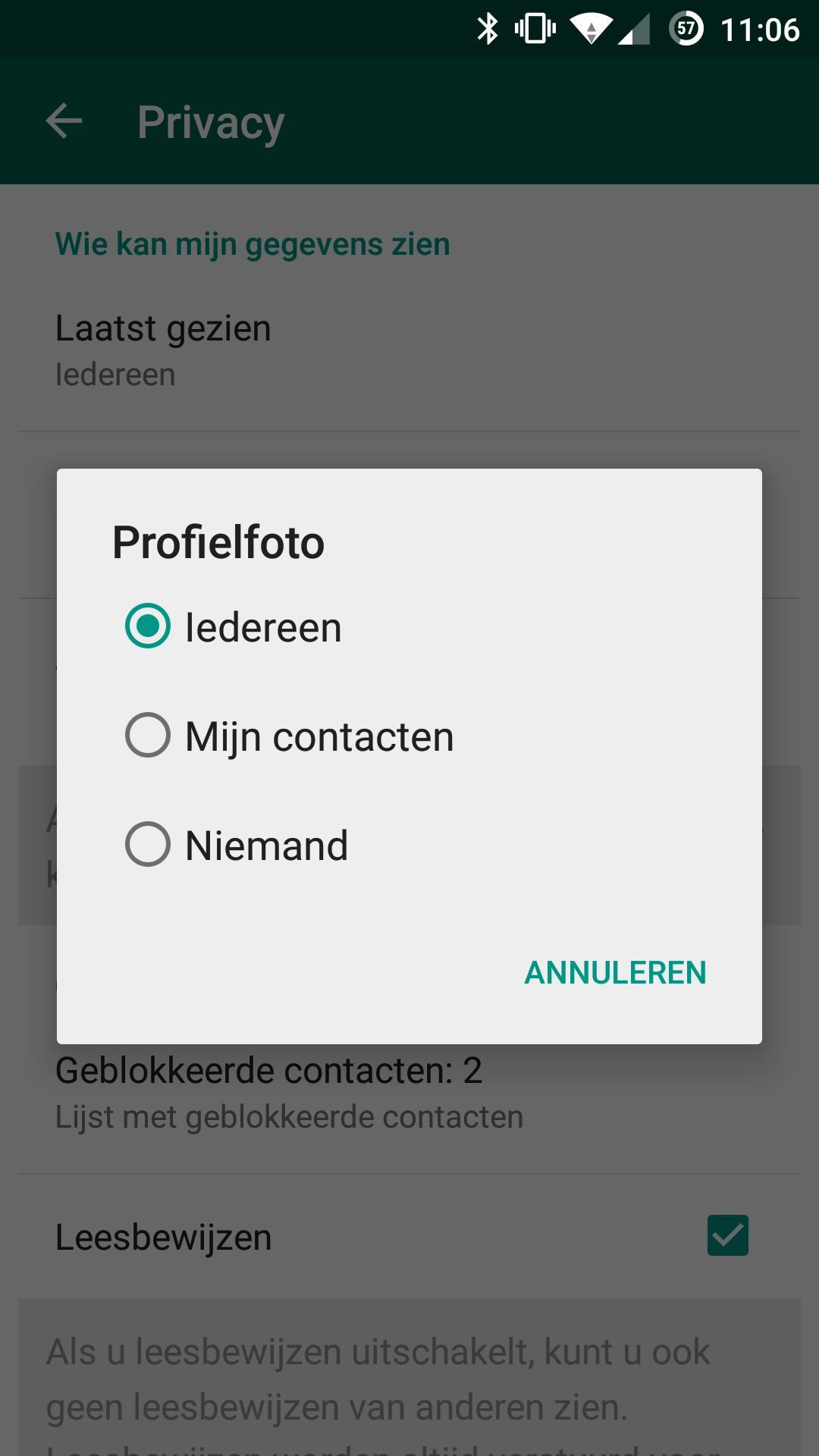 Je kunt in dit zelfde menu ook instellen wie jouw profielfoto mag zien. Daar heb je dezelfde opties, tussen 'iedereen', 'niemand' of 'Mijn contacten'.