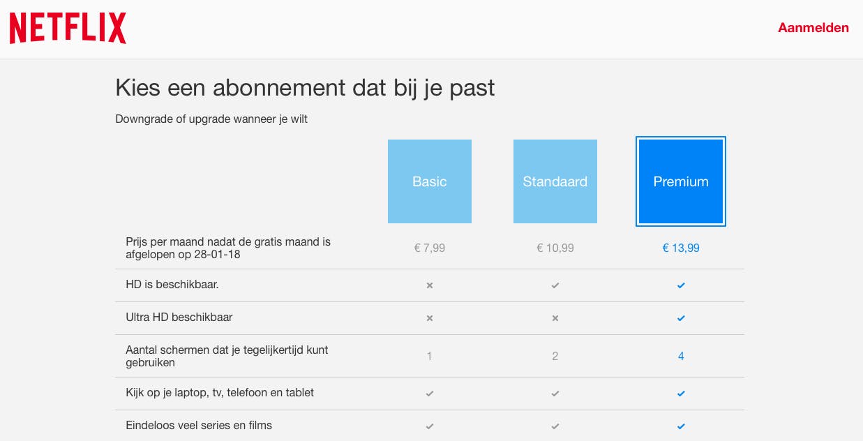 Als je nog geen Netflix-abonnement hebt, ga je naar www.netflix.com en klik op Kijk een maand gratis. Er zijn drie opties waaruit je kunt kiezen. Het basisabonnement heet, heel toepasselijk, Basis. Je betaalt hiervoor 7,99 euro per maand. Dit abonnement heeft echter twee nadelen, je kunt maar op één apparaat tegelijk iets kijken en je kunt geen inhoud in hd bekijken. Vooral het eerste is een nadeel als je met meerdere mensen in een huishouden woont. Een Standaard-abonnement is dan wellicht een betere keuze. Voor 10,99 euro per maand kun je dan met hetzelfde account op twee apparaten tegelijkertijd naar iets anders kijken. Ook zijn alle nieuwe films en series in hd-kwaliteit te bekijken. Met een Premium-account kun je dit zelfs met vier personen tegelijkertijd doen, dit is dus ideaal voor een gezin waarbij iedereen zijn eigen account wil hebben. Met dit abonnement kun je ook inhoud in ultra hd bekijken, mits dit beschikbaar is. Alle opties leveren je overigens een maand lang gratis een Netflix-abonnement. Je kunt je abonnement op elk moment stopzetten.