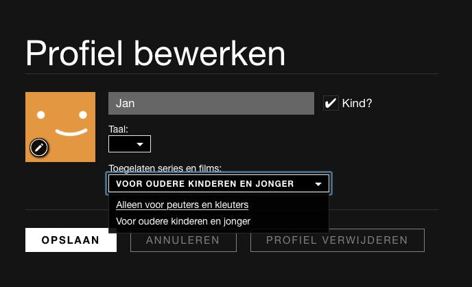 Ongeacht welk abonnement je kiest, onder één account kun je meerdere profielen aanmaken. Kijken je partner en jij nooit op hetzelfde moment naar iets anders, dan is een Basis-abonnement wellicht genoeg. Een profiel maak je aan om je eigen voorkeuren aan te geven, films aan je kijklijst toe te voegen en waarderingen af te geven zodat Netflix je betere suggesties kan doen. Ook vind je je eigen kijkgeschiedenis terug. Om een nieuw profiel aan te maken, log je in met je accountgegevens en klik je op Profiel toevoegen. Heb je al profielen toegevoegd, dan klik je op je account-icoontje rechts bovenin en kies je voor Profielen beheren. Geef een naam op en zet eventueel een vinkje voor kind. Bij een kindprofiel worden alleen films en series weergegeven die door Netflix voor 12 jaar en jonger zijn vrijgegeven. Het is ook aan te raden deze instelling voor iets oudere kinderen aan te vinken, zo kunnen je kinderen geen extreem gewelddadige inhoud zien. Klik op Doorgaan en het profiel wordt aangemaakt. Klik op het potloodje om eventueel een afbeelding voor het profiel op te geven en selecteer onder Toegelaten series en films de juiste instelling. Sluit af door op Klaar te klikken.
