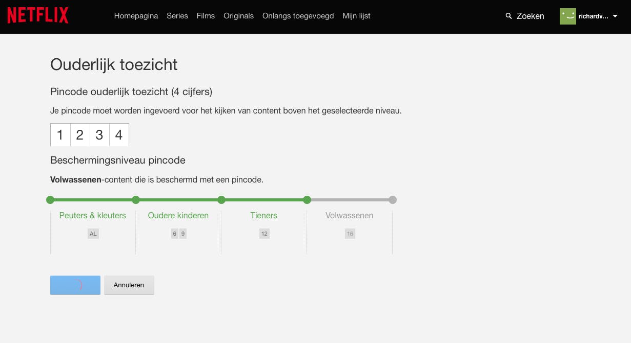 Ondanks het aanmaken van een profiel voor je kind, kan hij of zij kan nog wel volwassen inhoud zien door op jouw profiel te klikken. Om dit op te lossen, klik je op je profiel-icoontje, kies je voor Account en selecteer je Ouderlijk toezicht. Geef je account-wachtwoord op en klik op Doorgaan. Kies Pincode instellen en doorloop de stappen om een pincode in te stellen. Geef met de schuif aan welk beschermingsniveau je pincode heeft. Deze instelling geldt nu wel voor alle profielen, je moet zelf dus ook je pincode invoeren als je een film voor volwassenen wilt kijken. Om de restrictie op te heffen, zet je de schuif helemaal naar rechts. Je hoeft nu nergens meer een pincode in te geven.