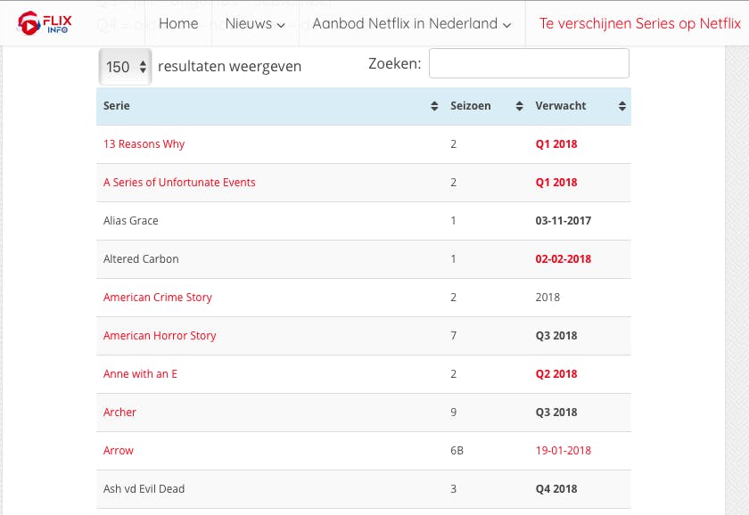 Kun je niet wachten tot het volgende seizoen van je favoriete serie? Neem dan eens een kijkje op www.netflix-nederland.nl en klik bovenin op Te verschijnen Series op Netflix. Je vindt hier alle bekende releasedata van series, sommige met exacte datum, andere met een kwartaalaanduiding.