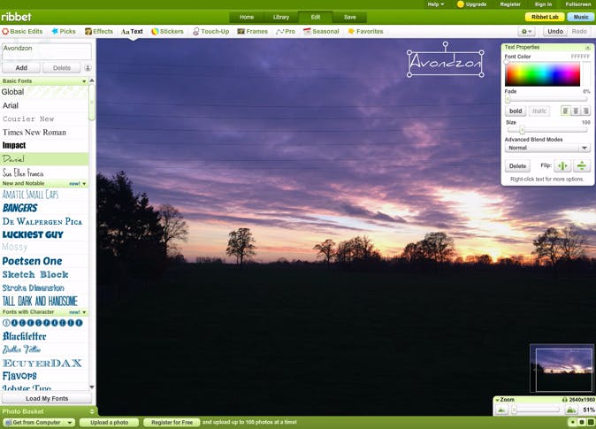 Zodra je foto geopend is, kun je via Basic Edits allerlei basisbewerkingen uitvoeren zoals bijsnijden, roteren, de belichting aanpassen, verscherpen of het formaat wijzigen. Met de knoppen bovenaan in de balk kun je onder andere speciale effecten en filters gebruiken, tekst toevoegen, stickers op je foto plakken, kaders gebruiken of portretten retoucheren. Let wel, voor bepaalde functies heb je een Premium-account nodig. Dat is nog altijd gratis, maar vereist wel een registratie. Ben je eenmaal geregistreerd, dan krijg je toegang tot professionelere tools zoals doordrukken en tegenhouden, niveaus en curven enzovoort. Klaar met bewerken? Dan kun je de foto in de oorspronkelijke resolutie downloaden in jpg- of png-formaat. Afdrukken of exporteren naar Picasa, Flickr of Facebook behoort eveneens tot de mogelijkheden. Gebruik je Google Chrome als browser? Dan kun je Ribbet ook als Chrome-extensie installeren.