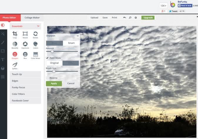 Ook via www.befunky.com/create kun je zowel foto's bewerken als collages maken. De tool werkt samen met Facebook, Flickr, Photobucket en Picasa, maar je kunt ook aan de slag met een voorbeeldfoto of een afbeelding van je harde schijf. De interface is dan wel volledig in het Engels, alles spreekt voor zich. Via Essentials heb je alles basistools binnen handbereik. Hier kun je onder andere bijsnijden, roteren of de belichting aanpassen. Om een foto te verscherpen kies je Sharpen. Hier is de Smart-modus erg interessant. Wil je maar een deel van de foto verscherpen? Dan vink je Paint Mode aan en kun je schilderen over bepaalde delen in de afbeelding.