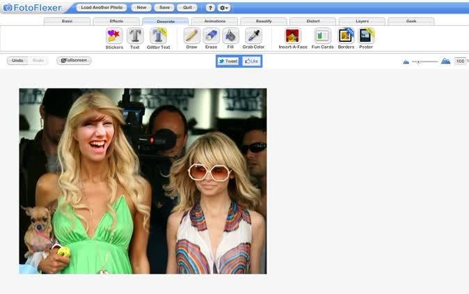 Ga naar Layers en open een extra beeld om twee foto's te laten samensmelten. Om bijvoorbeeld de transparantie aan te passen gebruik je Opacity. Via het tabblad Geek kun je nog een slimme schaar gebruiken om delen van je foto uit te snijden. Zin in iets geks? Via Decorate / Insert-A-Face zet je jouw smoel op die van een bodybuilder, Paris Hilton of een gorilla. Zodra je klaar bent, kun je de afbeelding opslaan in jpg- of png-formaat.
