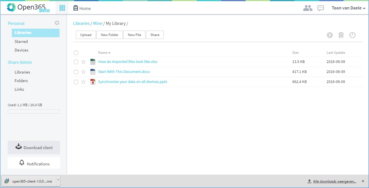 Normaliter wordt even later automatisch de bijhorende client gedownload. Daar hoef je je op dit moment echter nog niet om te bekommeren, temeer omdat je dit bestand ook altijd nog later kunt downloaden (zie ook tekstkader). Vervolgens druk je op I’m ready, waarna je bij Open365 aanmeldt met je nieuwe e-mailadres (<gebruikersnaam>@open365.io) en je wachtwoord. Op de vraag of Open365 meldingen mag weergeven antwoord je best met Toestaan. Het gaat namelijk onder meer over notificaties rond up- en downloads en (video)chatverzoeken. Even later beland je dan in je ‘hub’: een online dashboard met een overzicht van je (ook gedeelde) bestanden. Je merkt dat Open365 al een eerste ‘bibliotheek’ (My Library) voor je heeft klaargezet met daarin al een drietal voorbeeldbestanden (docx, xlsx en pptx). Het startschot is gegeven.