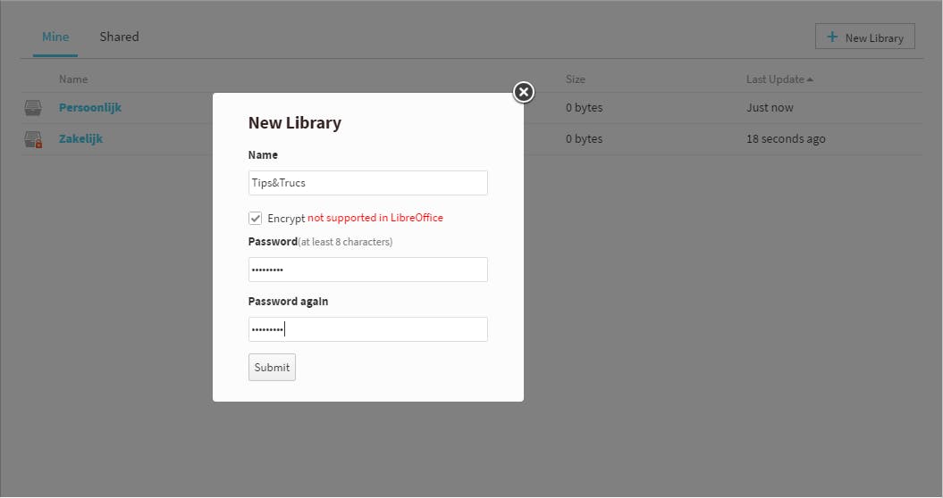 We kunnen ons zo voorstellen dat je niet meteen baat hebt met de standaardnaam My Library – of met de inhoud van die map. Geen nood: via het vuilnisbakje en je bevestiging heb je die zo verwijderd! Na een verversing van je browservenster staat de teller nu weer netjes op 0 bytes / 20.0 GB en verschijnt de melding dat je nog geen bibliotheken hebt gecreëerd. Dat heb je echter zo voor elkaar met de knop +New Library. Je kunt trouwens meerdere bibliotheken (met zelfgekozen namen) aanmaken, bijvoorbeeld een voor zakelijk en een voor persoonlijk gebruik. Merk op dat Open365 je ook toelaat een versleutelde bibliotheek te creëren – een vinkje bij Encrypted en een stevig wachtwoord (2x) volstaat. Op het moment van schrijven ondersteunde LibreOffice deze functie nog niet: wil je dus bijvoorbeeld vanuit Writer een bestand wegschrijven naar zo’n versleutelde bibliotheek, dan zal dat (nog) niet lukken. Maar goed, het is alvast nuttig als je data (tijdelijk) op een beveiligde manier wilt opslaan.