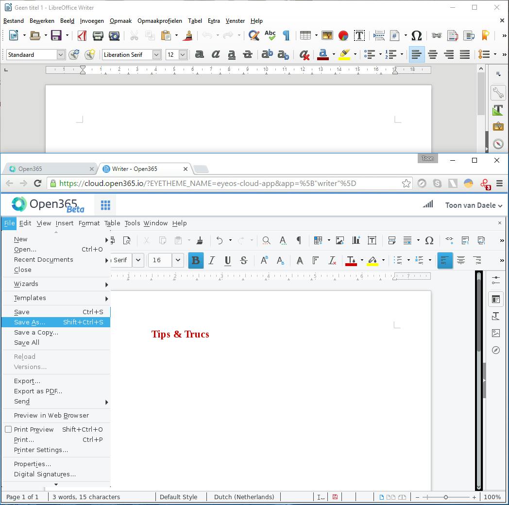 Voor alle duidelijkheid: op dit moment verkeert Open365 nog in een bètastadium. Dat vertaalt zich in een soms wat tragere respons maar ook in een duidelijk minder uitgebreide en gepolijste functieomvang dan de grote concurrenten Microsoft Office 365 en Google Docs (Apps).