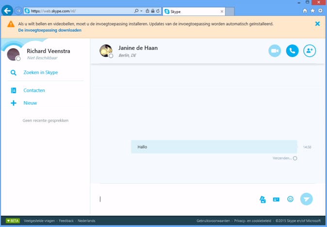 Skype is tegenwoordig ook voor je browser beschikbaar, al is deze optie nog wel in de bètaversie. Ga naar www.skype.com/nl, kies voor Skype voor web starten en meld je aan met je Skype-gegevens. Met de webversie kun je chatten, maar als je wilt videobellen, is het handiger om het programma te installeren.