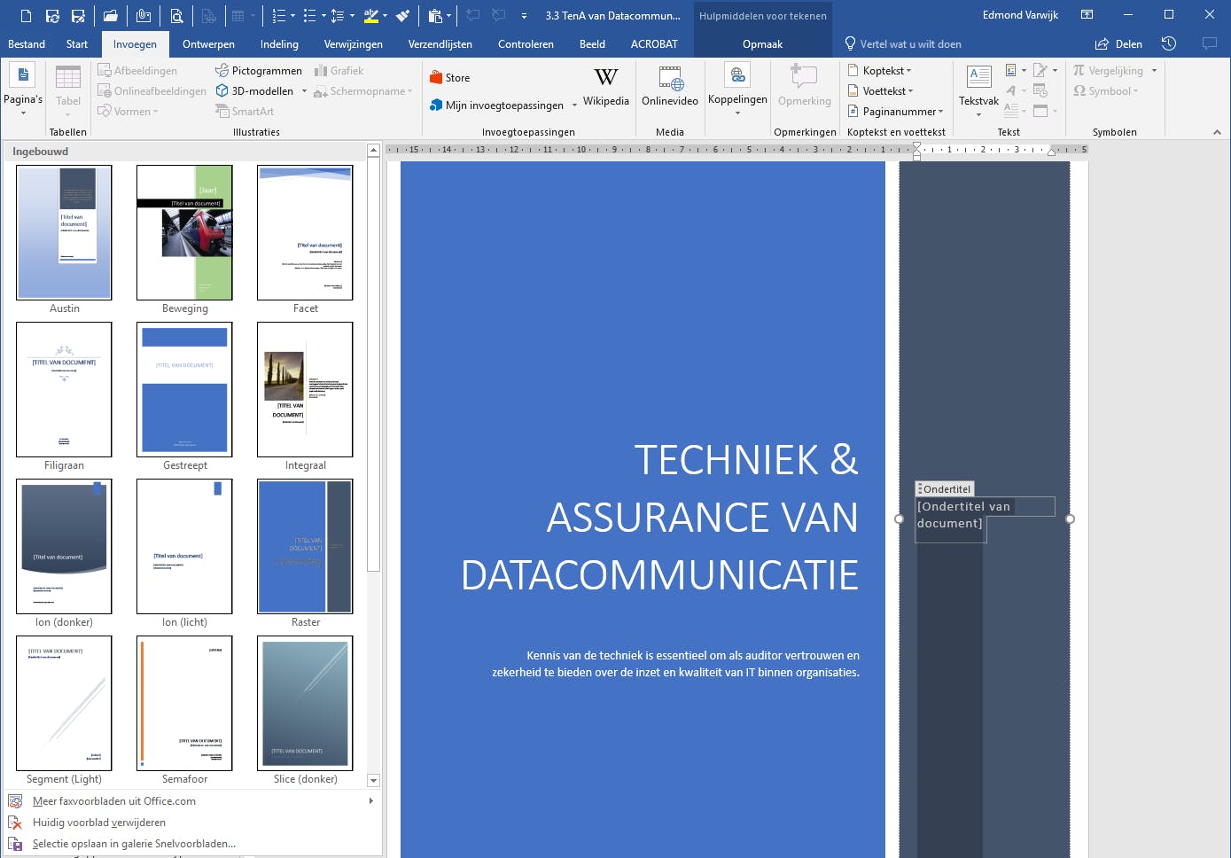 Word kent de mogelijkheid uit een hele reeks sjablonen een eigen voorblad te kiezen. Kies voor Invoegen / Pagina’s / Voorblad. Scrol door het aanbod en kies een voorblad wat jij mooi vindt en wat past bij het type document. Het sjabloon bestaat standaard uit een aantal tekstitems. Elk hiervan kun je bewerken door erop te klikken. Klik bijvoorbeeld op Titel van document om de titel van het document toe te voegen. Vul op die manier alle benodigde gegevens in en bewaar je document.
