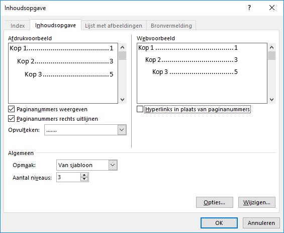 Wil je meer invloed op wat er precies in de inhoudsopgave komt, kies dan voor Aangepaste inhoudsopgave. Je hebt dan onder meer keuze uit het aantal niveaus en of je de paginanummers rechts wilt uitlijnen. Heb je andere stijlen dan Kop 1 en Kop 2 gebruikt en wil je dat die stijlen in de inhoudsopgave terugkomen, klik op dan op Opties en geef in de lijst met stijlen aan wat niveau 1, 2 en 3 is. Bevestig met OK.
