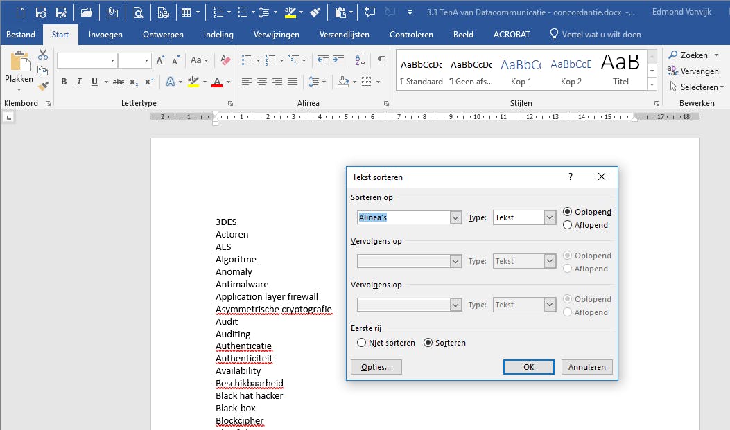 Wil je nu echt een professionele indruk maken met je document, voeg dan een trefwoordenregister, in Word index genoemd, toe. Zo’n lijst bevindt zich vaak achter in het document en bevat de belangrijkste woorden met daarbij opgesomd op welke pagina’s dat woord voorkomt. Wie deze mogelijkheid niet kent, zou direct geloven dat dit monnikenwerk is, maar de echte Word-kenners weten wel beter. Het invoegen van een trefwoordenregister bestaat namelijk maar uit twee stappen. Stap een is het markeren van alle woorden, stap twee bestaat uit het invoegen van de index. Om de belangrijkste woorden te markeren, maak je een nieuw document. Typ in dit document, onder elkaar, alle woorden die je in de index wilt hebben. Op elke regel één woord. Om doublures te voorkomen, kun je met Ctrl+A de lijst selecteren en via Start / Alinea / Sorteren de woorden sorteren. Loop nu door de lijst en haal alle dubbels eruit. Bewaar daarna het document via Bestand / Opslaan op de harde schijf.