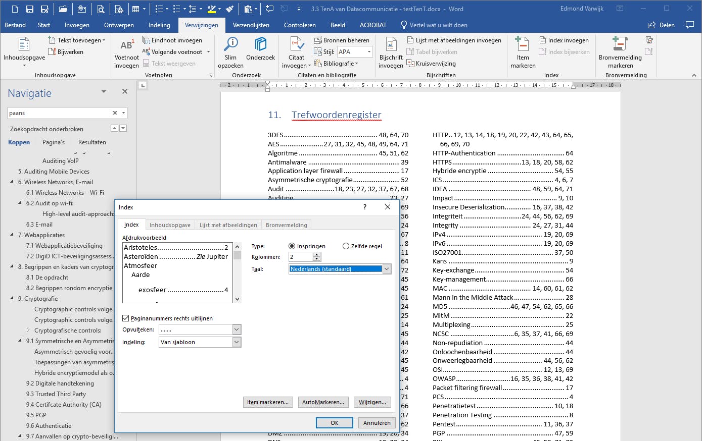 Om de gemaakte index aan je document toe te voegen, ga je naar de plaats waar de index terecht moet komen, meestal op een van de laatste pagina’s. Kies dan voor Verwijzing / Index invoegen / AutoMarkeren. Navigeer in het pop-upvenster naar je zojuist gemaakte index. Afhankelijk van de grootte van de index en hoeveel woorden de lijst bevat, duurt het even voor je Word weer kunt gebruiken. De markeerfunctie heeft bovendien alle markeringen zichtbaar gemaakt. Dit kun je uitschakelen door het ¶-icoontje in Start weer uit te schakelen. Er lijkt nu niets veranderd, maar onder water zijn alle woorden uit de lijst in het echte document gemarkeerd. Nu kun je de index invoegen. Kies opnieuw Verwijzing / Index invoegen, maar zet nu een vinkje bij Paginanummers rechts uitlijnen met puntjes als opvulteken en kies voor 2 bij Kolommen. Dat geeft vaak het mooiste resultaat. Klik dan op OK.