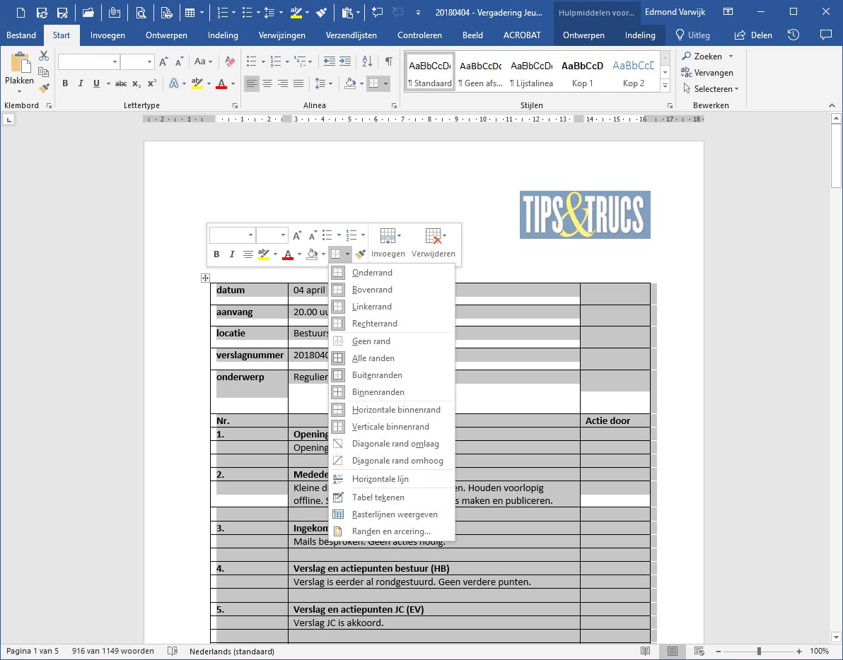 Bestaat een document eigenlijk vooral uit een hele reeks items of is het overzichtelijker om de informatie in kolommen te zetten, maar wil je niet dat de tabel zichtbaar is, werk dan met een verborgen tabel. Dit kan bijvoorbeeld handig zijn bij een vergaderverslag. Zo’n document kent namelijk altijd dezelfde opbouw en bestaat uit een agenda-item met een nummer, de inhoud en erachter soms nog een nieuw actiepunt. Een verborgen tabel is hier een uitkomst omdat je de informatie van een vergadering nooit op één regel kwijt kunt. Maak een nieuw document en voeg via Invoegen / Tabel een tabel in, bijvoorbeeld met drie kolommen. Vul nu de tabel met de informatie. Wil je ergens witruimte (lege regels), sla dan een paar rijen in de tabel over. Je kunt oneindig tabelrijen toevoegen door simpelweg de cursor in de laatste cel rechtsonder te plaatsen en Tab ingedrukt te houden. Is alles naar wens en is het document klaar, ga dan via Ctrl+G en dan 1 / Enter naar de eerste pagina. Klik in de tabel en klink linksboven de tabel op het kruisje om de hele tabel te selecteren. Kies dan in de zwevende werkbalk Randen / Geen rand. Je hebt de tabel nu onzichtbaar gemaakt en de informatie staat nu netjes geordend op een rijtje.