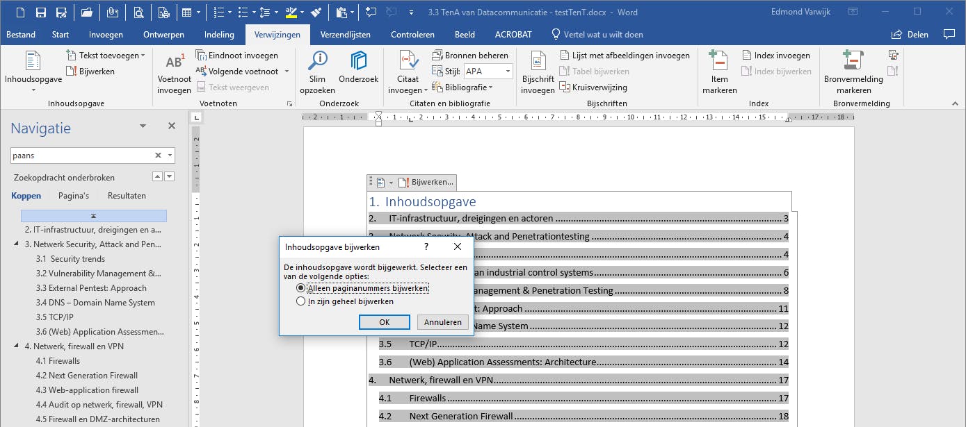 Tenzij je een inhoudsopgave of trefwoordenindex echt als allerlaatste handeling in een document uitvoert, zul je het soms ook moeten updaten. Klik daarvoor met de rechtermuisknop op de inhoudsopgave of index en kies Veld bijwerken. Bij het bijwerken van een inhoudsopgave kun je kiezen tussen Alleen paginanummers bijwerken of In zijn geheel bijwerken.