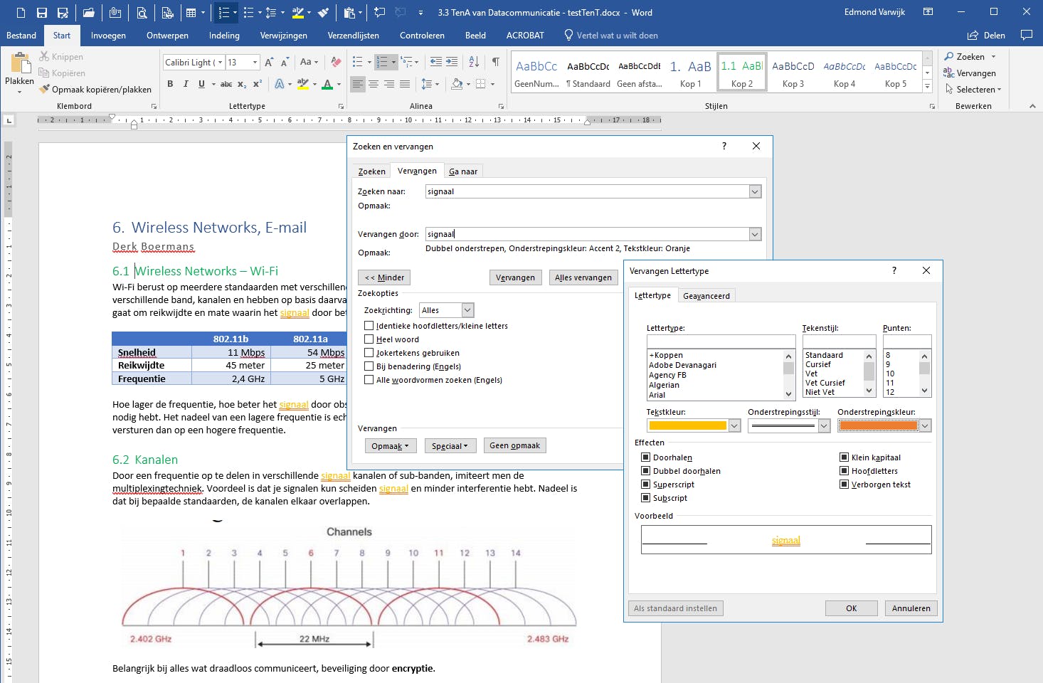 Wil je in je document nog iets aanpassen aan de opmaak, dan doe je dat door stijlen toe te passen. Via Start / Stijlen kun je elk deel van het document een passende opmaak geven, deze is bovendien identiek voor alle delen waar je die stijl op toepast. Wil je nu de opmaak van zo’n toegepaste stijl wijzigen, pas dan de opmaak van het tekstdeel aan en klik met de rechtermuisknop in het menu Stijlen op de desbetreffende stijl van dat tekstdeel en kies voor Stijl bijwerken om met selectie te laten overeenkomen. Je zult zien dat dan alle delen die de betreffende stijl hadden ineens het nieuwe uiterlijk hebben. Maar soms is dat niet genoeg. Soms hebben de delen niet die stijl of niet dezelfde stijl. Dan kun je de bekende Zoeken en Verangen-functie gebruiken om opmaak op te sporen én te veranderen. Open Zoeken en Verangen via Ctrl+H. Klik op Meer. Typ nu in de eerste regel bij Zoeken naar hetgeen je zoekt en herhaal dat bij Vervangen door. Maar met de cursor nog in het vak Vervangen door klik je op Opmaak. Selecteer nu de opmaakkenmerken waarmee je de tekst wilt vervangen. Bevestig met OK en daarna Vervangen of Alles vervangen. Zoek je bijvoorbeeld een woord en wil je overal waar dat woord staat het oranje en onderstreept hebben, dan is dit de manier om het te doen. Er zijn oneindige mogelijkheden. Je kunt ook zoeken op delen met een specifieke opmaak door al bij het vak Zoeken naar op Opmaak te klikken en opmaakkenmerken in de zoekopdracht mee te geven.