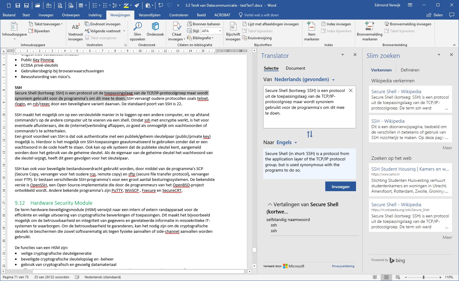 Het zal vaak voorkomen dat je naast Word ook je browser open hebt staan, bijvoorbeeld om even snel iets op te kunnen zoeken: een vertaling, een betekenis, een alternatief woord, ... Dat is geen noodzaak meer, want Microsoft heeft de laatste jaren veel van de kennis die je op internet zoekt ook in Office gestopt. Deze ‘intelligente services’ gebruiken de cloud om antwoord te zoeken op dingen die je wilt weten tijdens het schrijven of om een opmaak te vinden als je in PowerPoint werkt. Voorwaarde is wel dat je Office 365 gebruikt, in een standaardversie van het pakket werkt dit nog niet. Ga naar Controleren en klik op Vertalen. De eerste keer krijg je een pop-upvenster met de vraag of je deze intelligente services wilt inschakelen. Privacy kan een reden zijn dat niet te doen, de bij de diensten behorende privacyverklaring kun je lezen door op Privacyverklaring te klikken. Wil je de diensten gebruiken, klik dan op Inschakelen. Wil je nu bijvoorbeeld een regel of woord vertalen, selecteer het in Word en in de Translator-balk en je ziet direct de vertaling. Bij Naar kun je de taal kiezen. Via Document kun je zelfs een heel document vertalen. Andere voordelen van deze intelligentie zijn een verbeterde spellingscontrole en de mogelijkheid om via Verwijzingen / Slim opzoeken informatie over een woord (van Wikipedia of Bing-internet) direct in Word te bekijken.
