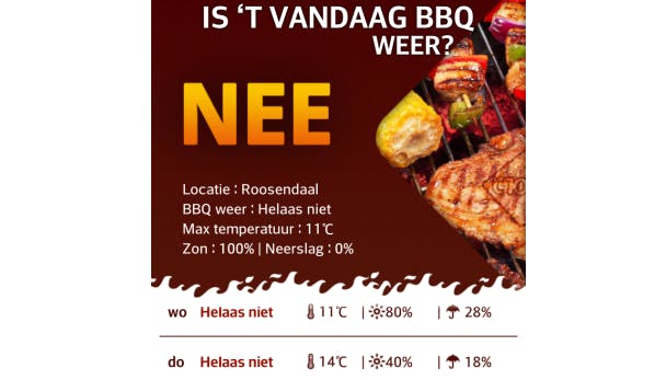 De app geeft aan wat de kans op neerslag is, hoe warm het is en geeft direct een simpel antwoord op de vraag: is het barbecueweer? Luister trouwens niet altijd naar deze app, want ook onder een afdakje kun je het lekkerste vlees grillen voor je gasten. Dan maakt het niet uit hoe hard het regent.