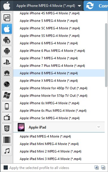 Vanuit het hoofdvenster kun je via een uitklapmenu al meteen uit tal van profielen selecteren, netjes gecategoriseerd in rubrieken als Apple, Android, LG, Microsoft, TV Devices, HTML5 Embed Video en ook Audio Files (als je alleen de audio wilt extraheren). Elke rubriek heeft op zijn beurt diverse profielen. Kies je bijvoorbeeld Apple dan kun je uit talrijke iPhone-, iPad-, iPod- en Apple TV-modellen selecteren.