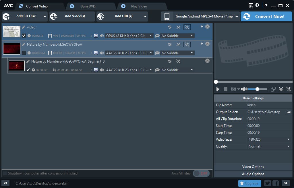Zodra je een geschikt profiel hebt aangeduid kun je aan de slag. Je hoeft nu maar een of meerdere videobestanden naar het venster te verslepen of die te importeren via Add Video(s). Vanuit het tabblad Add URL(s) is het bovendien mogelijk online video’s, bijvoorbeeld uit Facebook, Vimeo of YouTube, te downloaden. De geïmporteerde video’s worden op een rijtje gezet en met Convert Now! kun je die in principe al meteen converteren. Wil je de diverse video’s tot één groot videobestand versmelten, zet dan onderaan de knop Join All Files op ON. De standaard uitvoermap lees je af in het rechterpaneel, bij Basic Settings, en kun je van hieruit ook aanpassen.