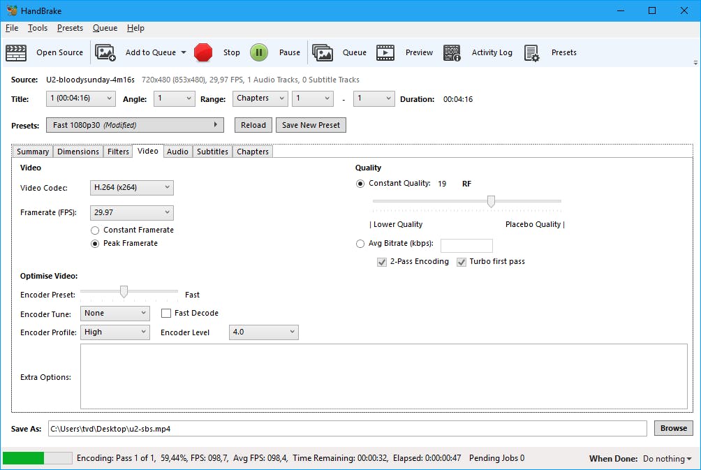 Met andere parameters beïnvloed je de kwaliteit (bitrate van 1 Mb/s en framerate van 30 fps):